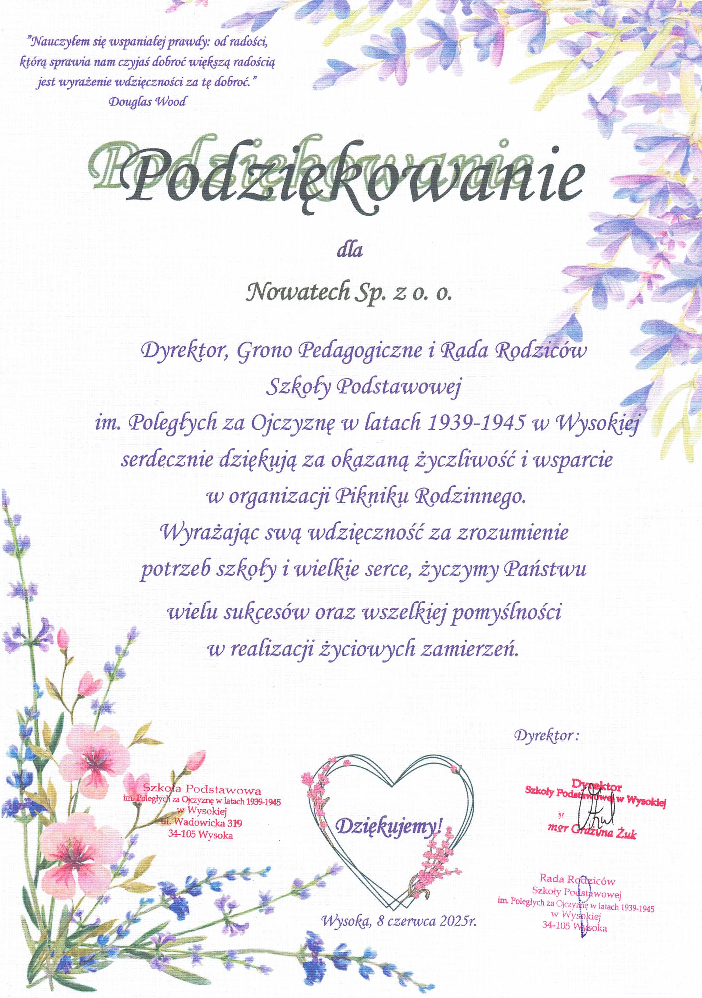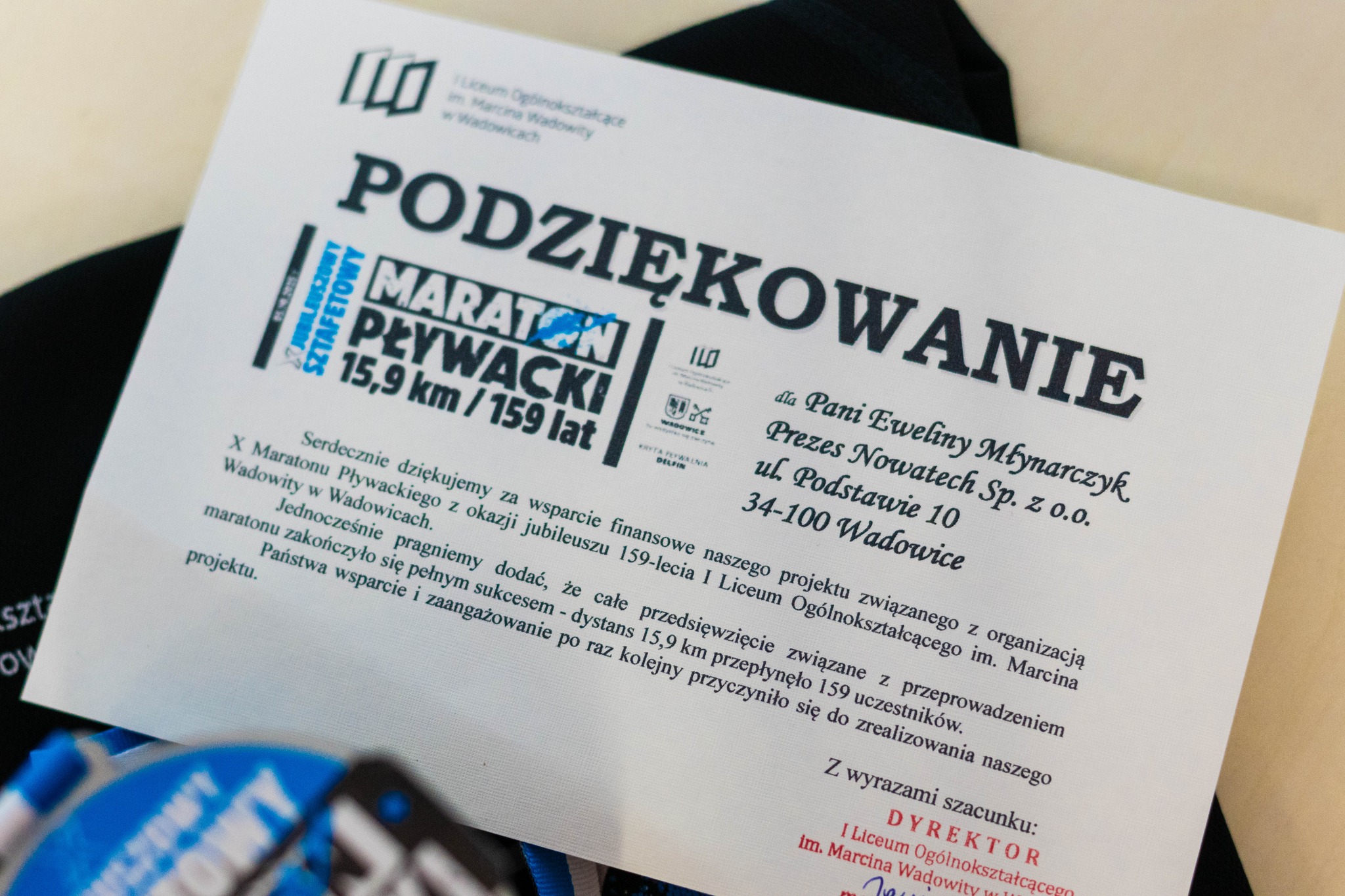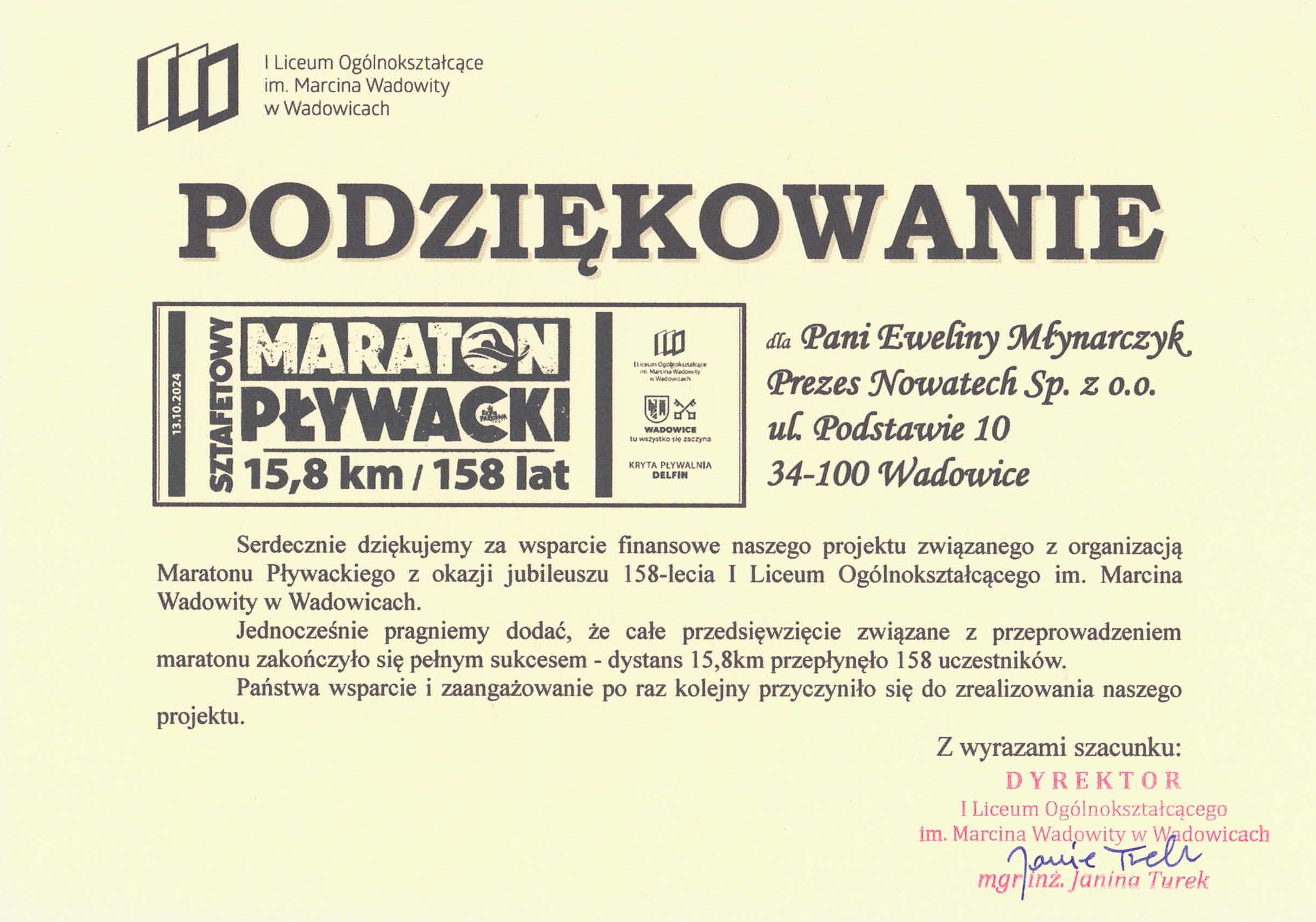 Z radością informujemy, że firma NOWATECH otrzymała podziękowania za udzielenie wsparcia X Maratonowi Pływackiemu, zorganizowanemu z okazji jubileuszu 159-lecia I LO im. Marcina Wadowity w Wadowicach. To dla nas zaszczyt móc wspierać wydarzenia, które łączą pasję, rywalizację i tradycję — a przede wszystkim promują aktywność fizyczną wśród młodzieży i mieszkańców naszego regionu. Gratulujemy organizatorom i uczestnikom fantastycznej atmosfery oraz sportowych wyników! Razem tworzymy społeczność, która inspiruje do działania.