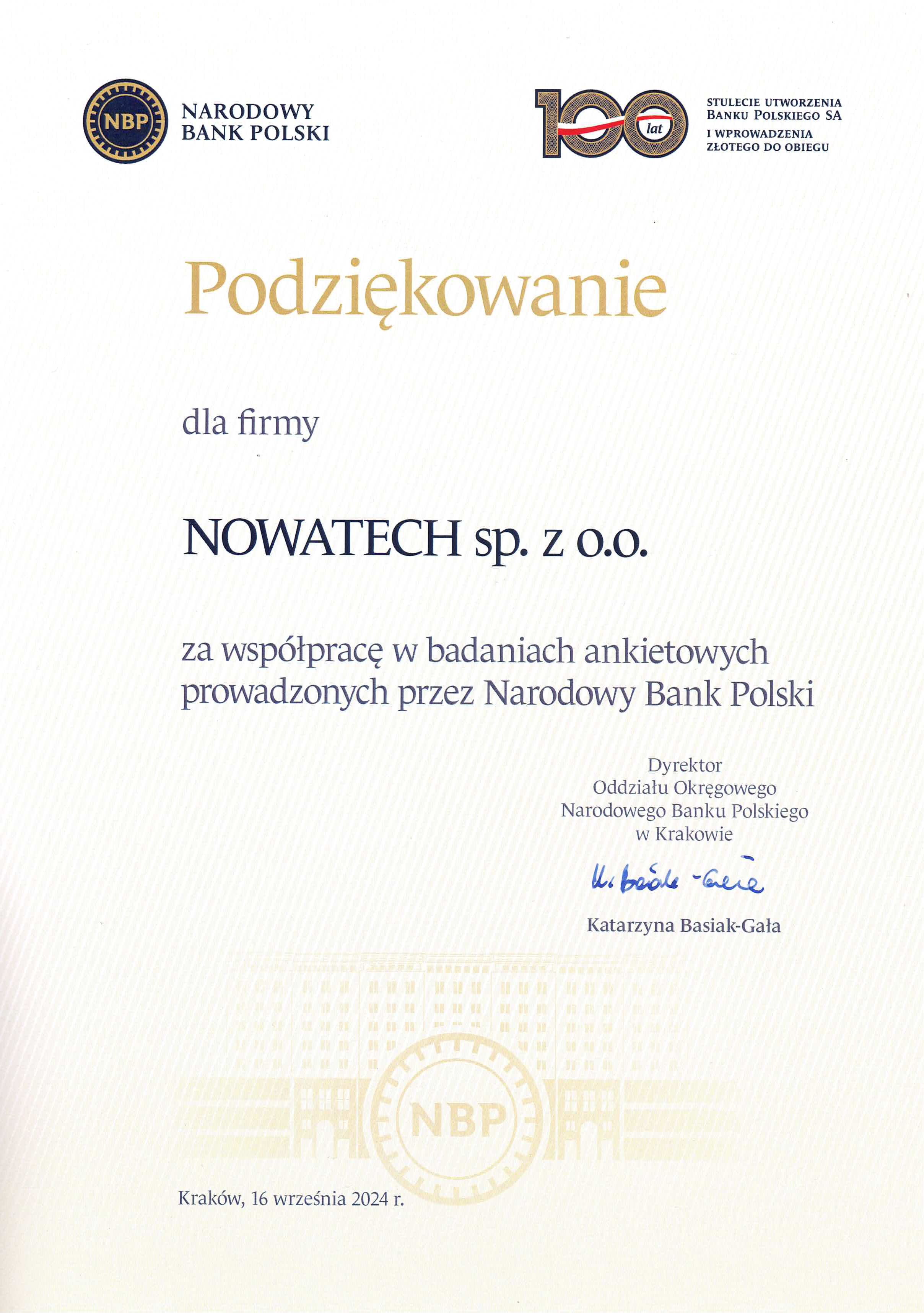 Z przyjemnością informujemy, że firma Nowatech Sp. z o.o. – polski producent zgrzewarek elektrooporowych i doczołowych – po raz kolejny otrzymała wyróżnienie za aktywny udział w badaniach ankietowych prowadzonych przez Narodowy Bank Polski. Uroczystość wręczenia pamiątkowych monet odbyła się 18 września w Krakowie. Serdecznie dziękujemy za to wyjątkowe wyróżnienie oraz docenienie naszej współpracy.