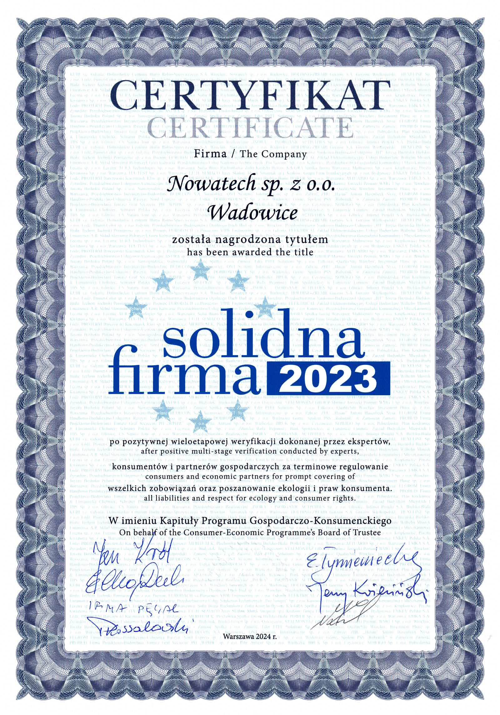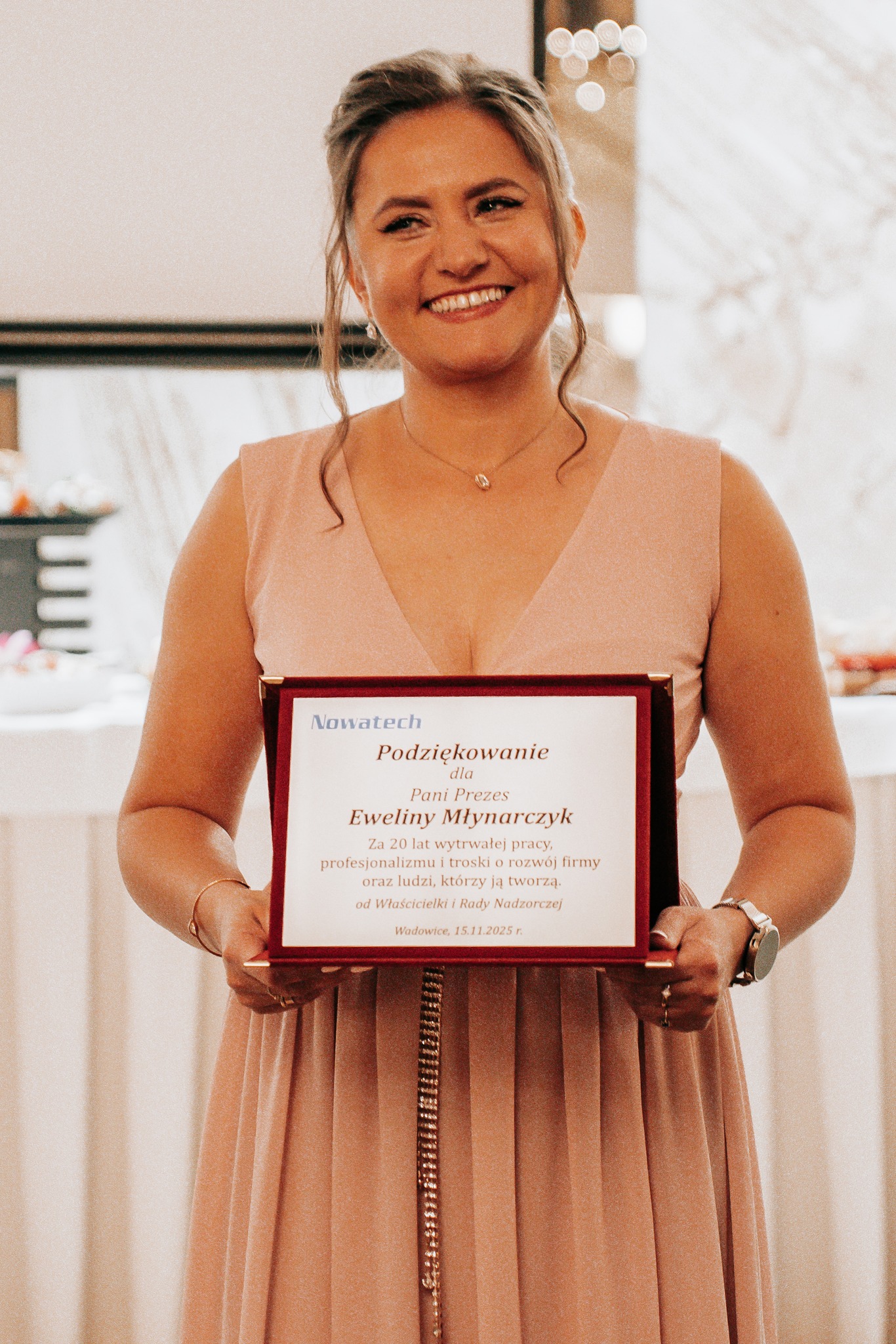 Z dumą informujemy, że Prezes Zarządu Nowatech, Ewelina Młynarczyk, została uhonorowana Diamentowym Certyfikatem Rzetelności Płatniczej podczas jubileuszowej 15. Gali Rzetelna Firma, która odbyła się 9 października 2025 roku w hotelu DoubleTree by Hilton w Warszawie. To prestiżowe wyróżnienie przyznawane jest firmom, które przez wiele lat prowadzą działalność w sposób uczciwy, przejrzysty i odpowiedzialny, potwierdzając najwyższe standardy w zakresie wiarygodności płatniczej i etyki biznesowej. Udział Prezes Eweliny Młynarczyk w tym wydarzeniu to nie tylko osobisty sukces, ale także dowód uznania dla całej firmy Nowatech. Diamentowy Certyfikat to efekt wieloletniej, konsekwentnej pracy całego zespołu oraz partnerskich relacji z Klientami i Kontrahentami. Rzetelność i zaufanie od zawsze są fundamentem naszej działalności. Nowatech to rodzinna firma ceniąca sobie nade wszystko wartości takie jak zaufanie, uczciwość, przejrzystość w prowadzeniu biznesu i otwartość na rzetelną współpracę. Firma Nowatech od lat stawia na odpowiedzialne prowadzenie biznesu, budując trwałe relacje oparte na transparentności i uczciwości. Diamentowy Certyfikat Rzetelności Płatniczej jest kolejnym potwierdzeniem wysokich standardów, którymi kieruje się w codziennej działalności. Serdeczne podziękowania kierujemy do naszych Klientów, Partnerów Biznesowych oraz całego Zespołu Nowatech – to dzięki wspólnemu zaangażowaniu możemy nieustannie się rozwijać i realizować nasze cele w duchu rzetelności.