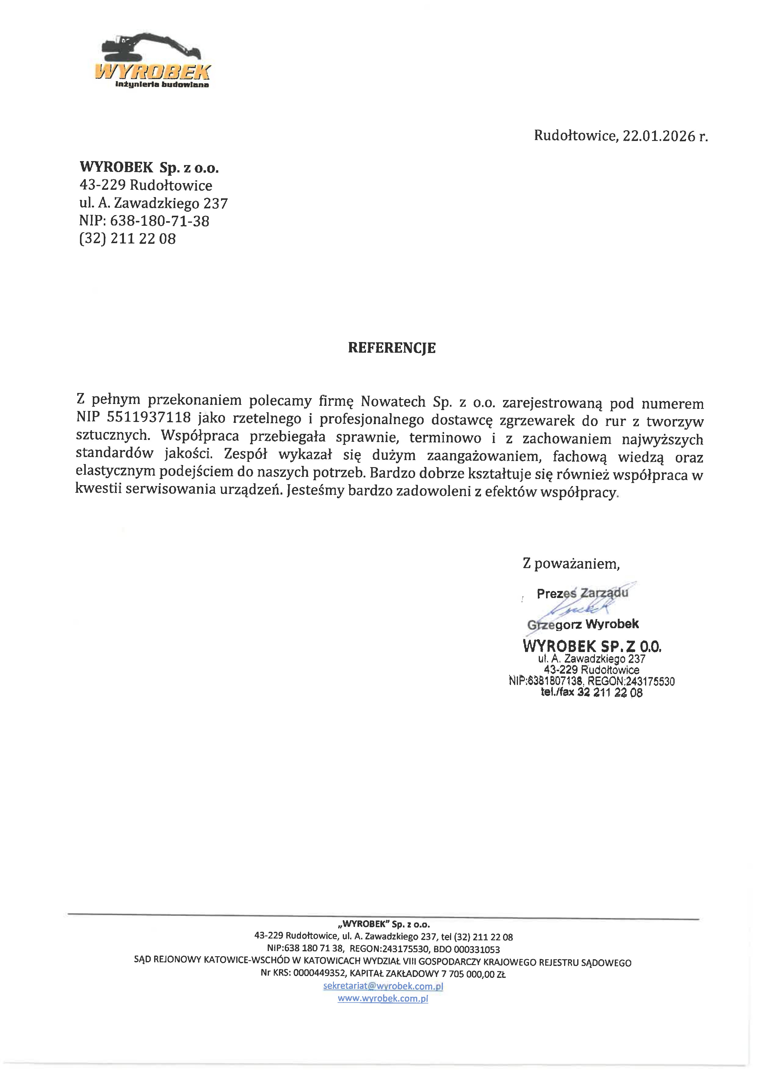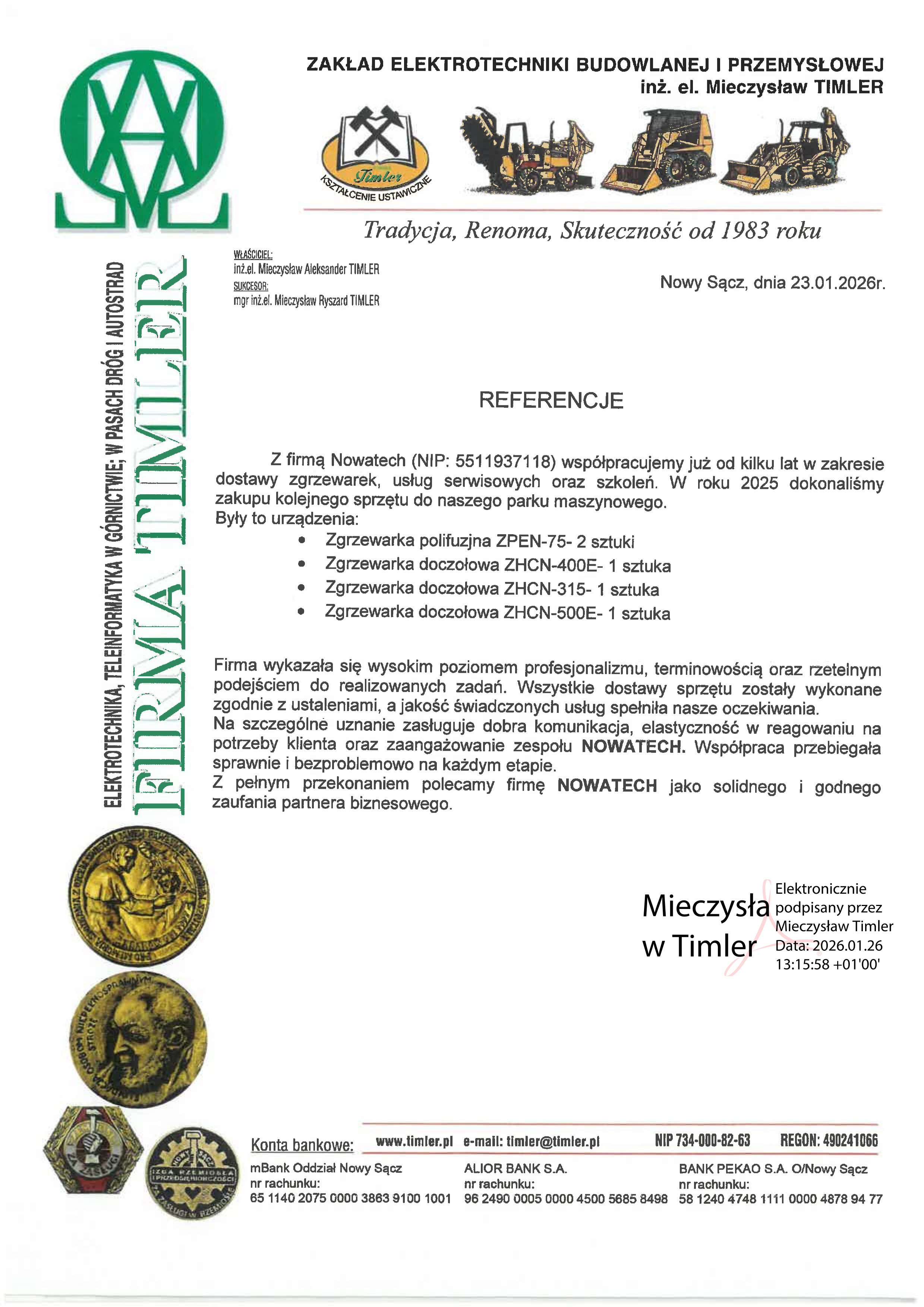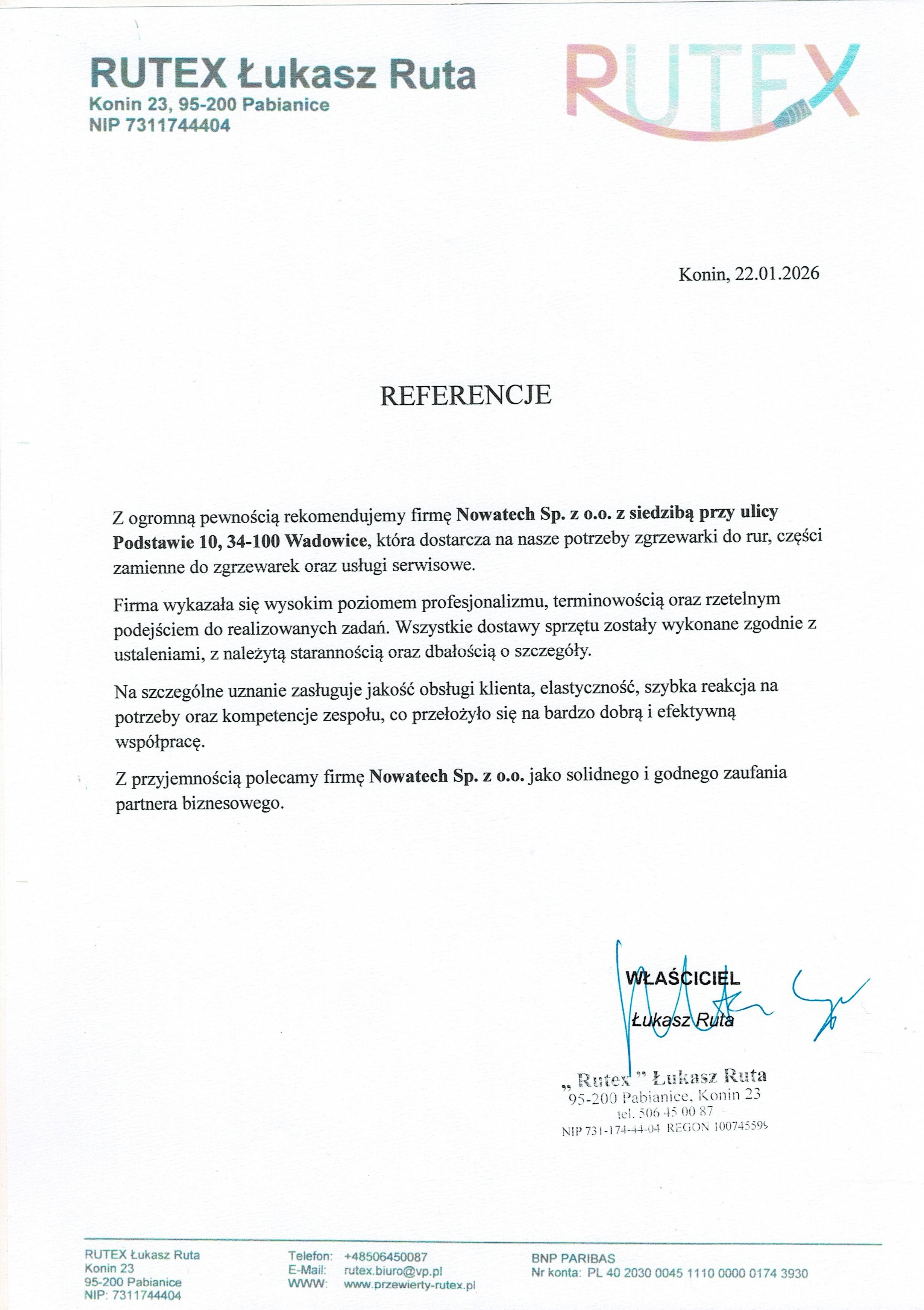 Potwierdzeniem profesjonalizmu firmy Nowatech, są listy referencyjne nadesłane przez naszych klientów. Wysoka jakość materiałów użytych do produkcji zgrzewarek oraz profesjonalna obsługa klienta jest gwarancją zadowolenia ze współpracy z naszą firmą. Dziękujemy za zakup zgrzewarek firmy Nowatech i zaufanie, jakim nas Państwo obdarzyli.