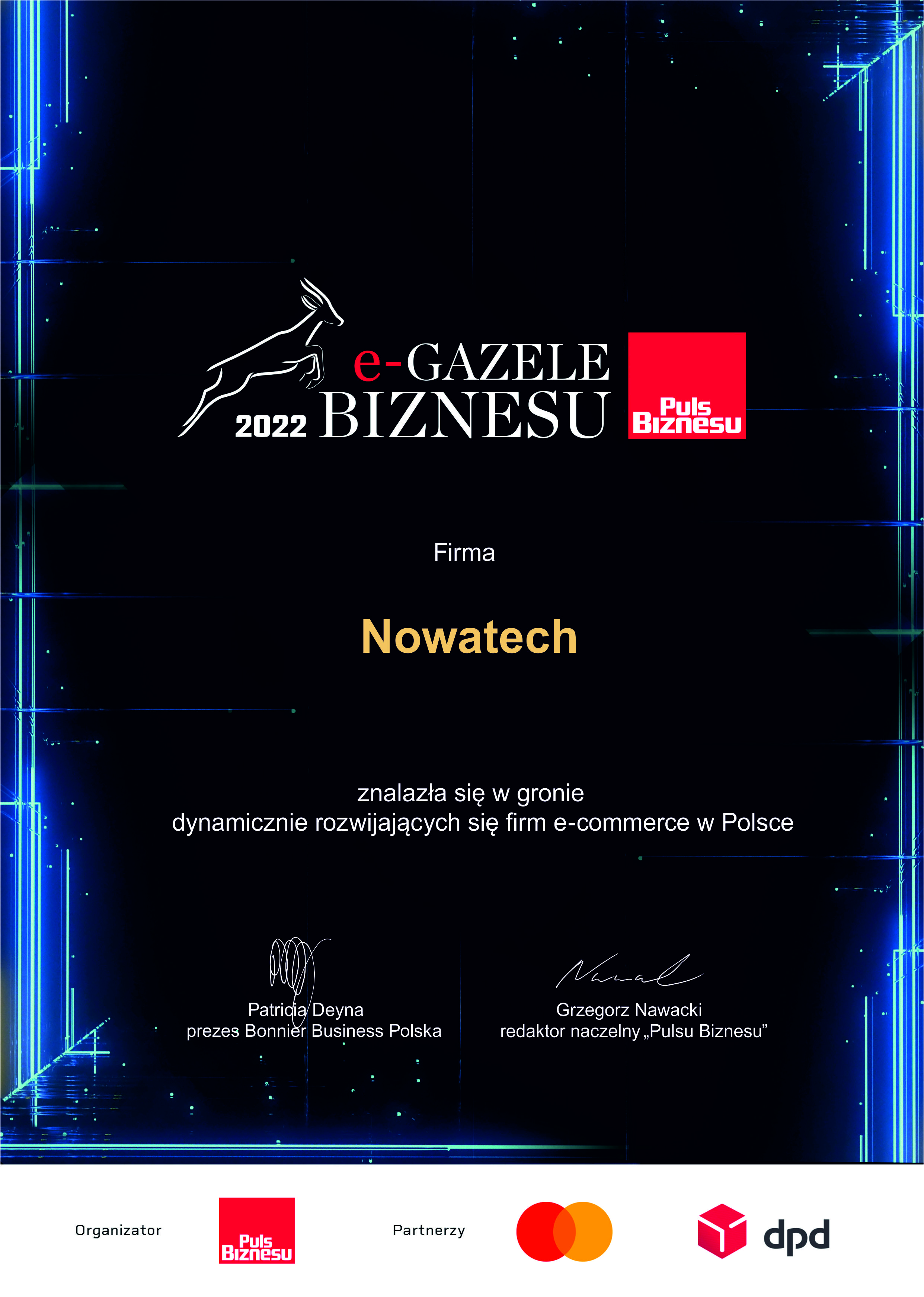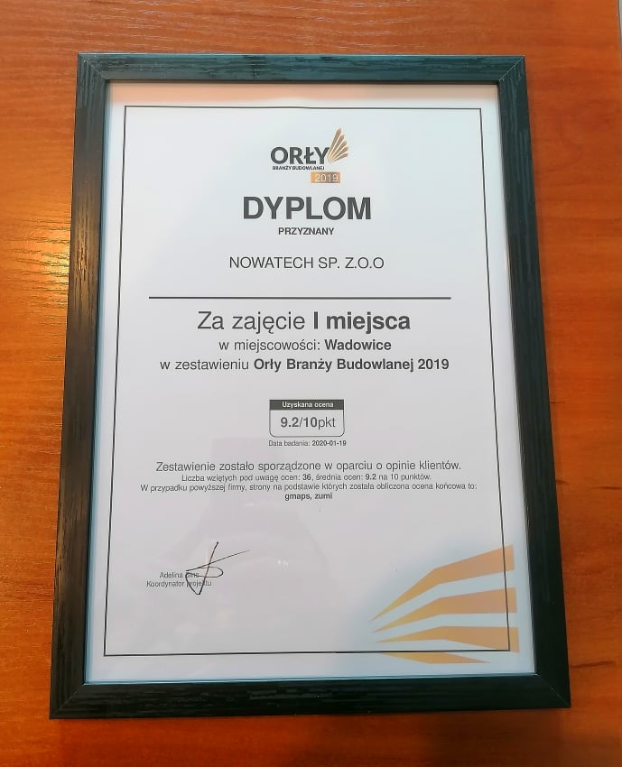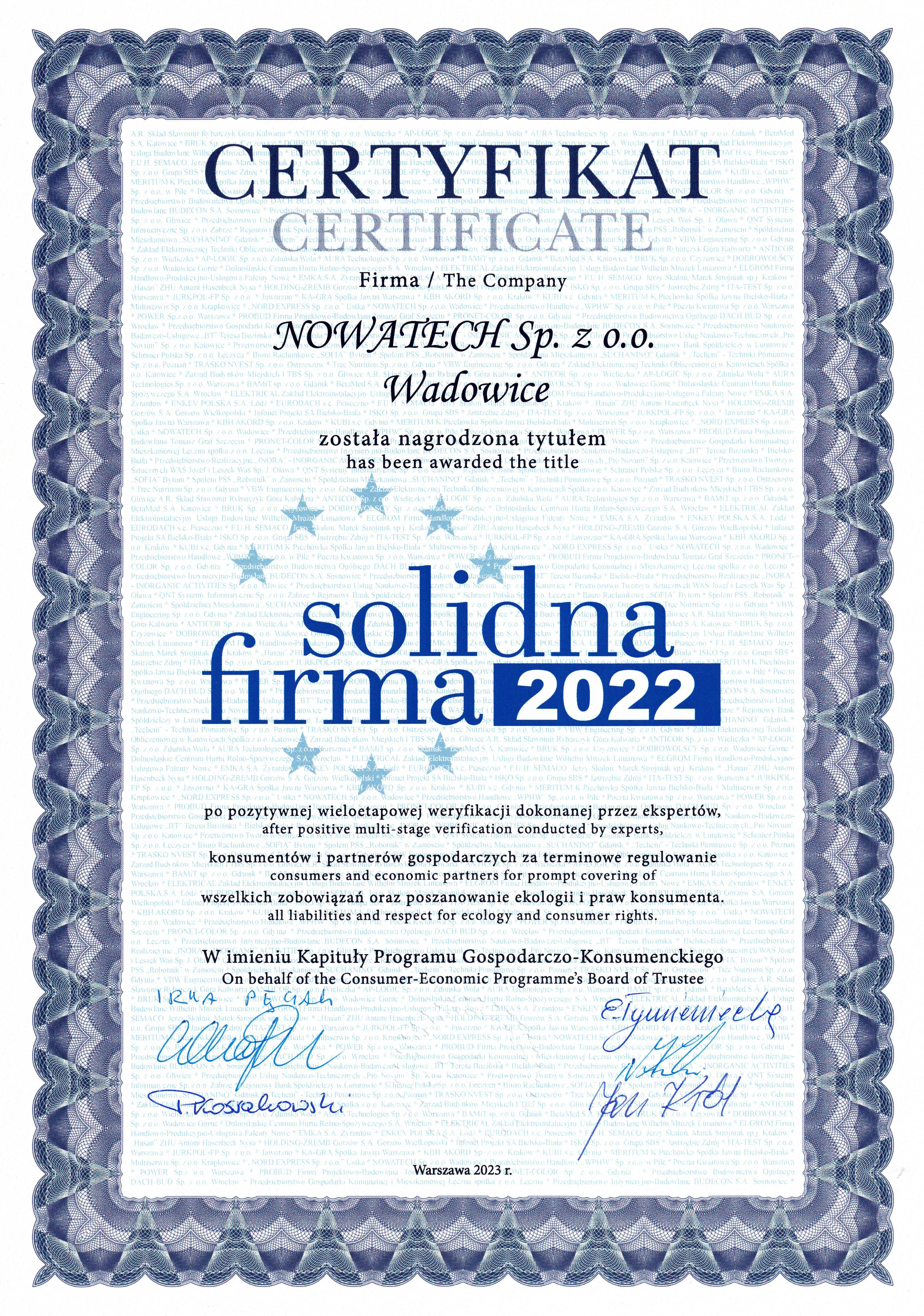 We are proud to announce that the President of the Management Board of Nowatech, Ewelina Młynarczyk, was honoured with the Diamond Certificate of Payment Reliability during the 15th anniversary Reliable Company Gala, which took place on 9 October 2025 at the DoubleTree by Hilton hotel in Warsaw. This prestigious award is granted to companies that have been operating in an honest, transparent and responsible manner for many years, confirming the highest standards of payment reliability and business ethics. The participation of President Ewelina Młynarczyk in this event is not only a personal success, but also a token of appreciation for the entire Nowatech company. The Diamond Certificate is the result of many years of consistent work by the entire team and partnership relations with customers and contractors. Reliability and trust have always been the foundation of our business. Nowatech is a family-owned company that values trust, honesty, transparency in business and openness to reliable cooperation above all else. For years, Nowatech has been committed to responsible business practices, building lasting relationships based on transparency and integrity. The Diamond Certificate of Payment Reliability is further confirmation of the high standards that guide our daily operations. We would like to express our sincere thanks to our customers, business partners and the entire Nowatech team – it is thanks to our joint commitment that we can continue to grow and achieve our goals in a spirit of reliability.