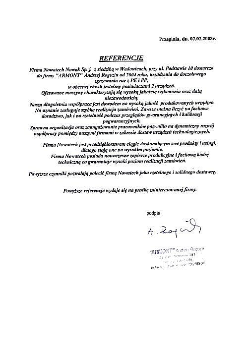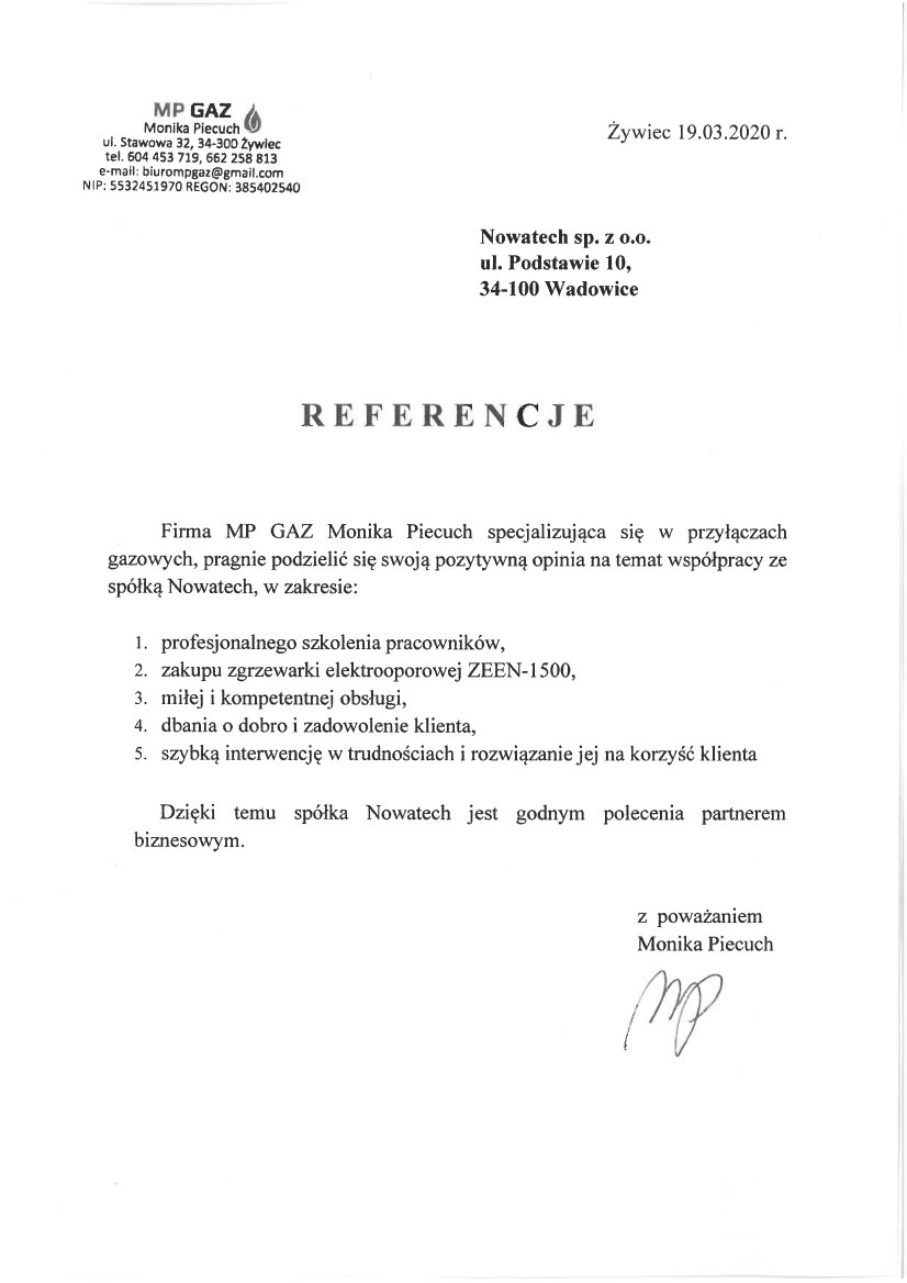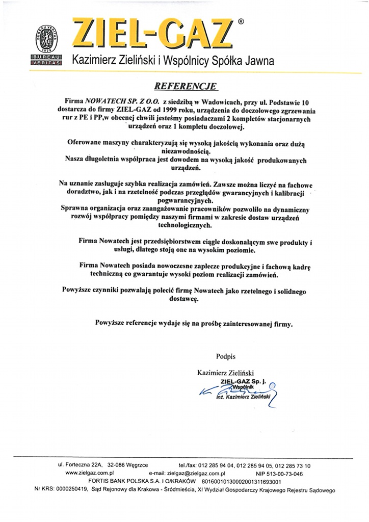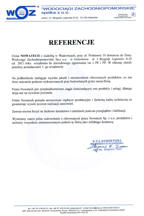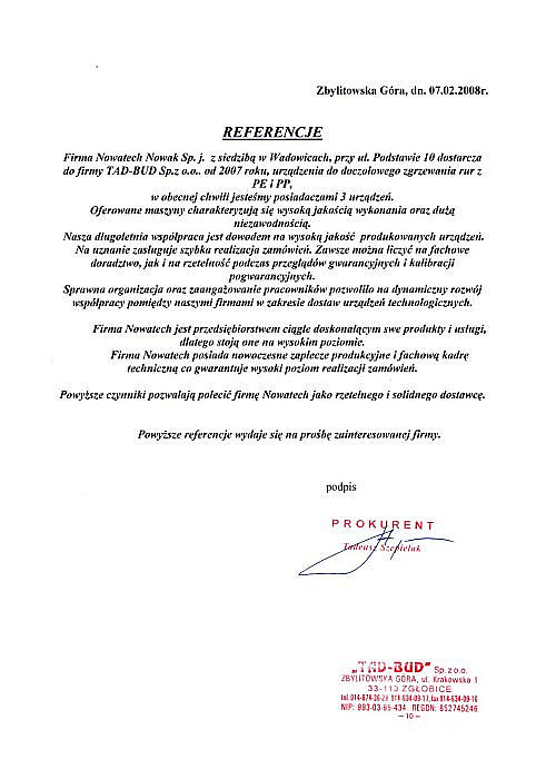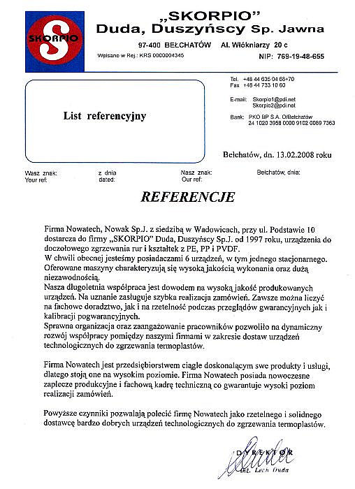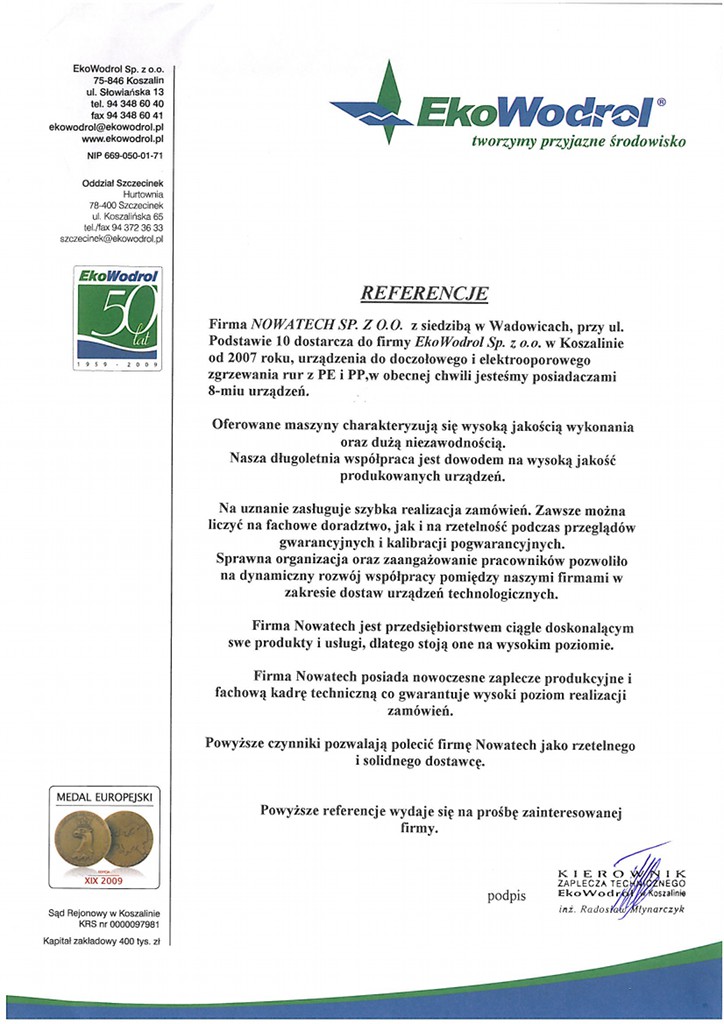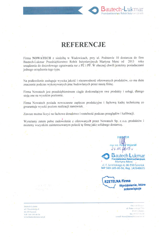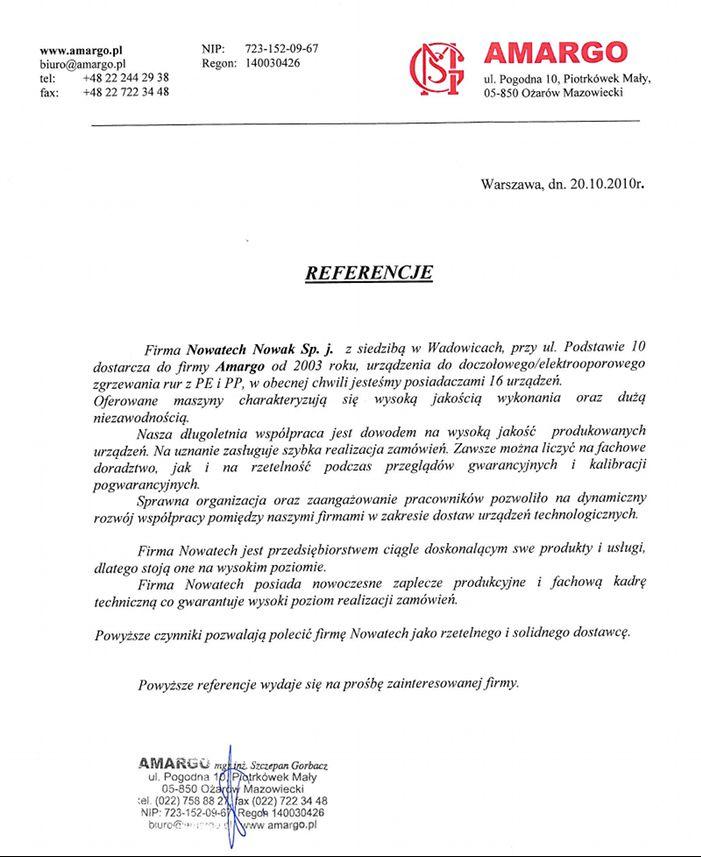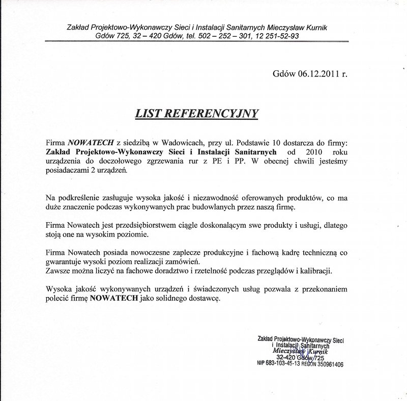 The confirmation of Nowatech's professionalism are the letters of References sent by our clients. The high quality of materials used to manufacture welders and professional customer service is a guarantee satisfaction from cooperation with our company. Thank you for purchasing Nowatech welding machines and for the trust you have placed in us.