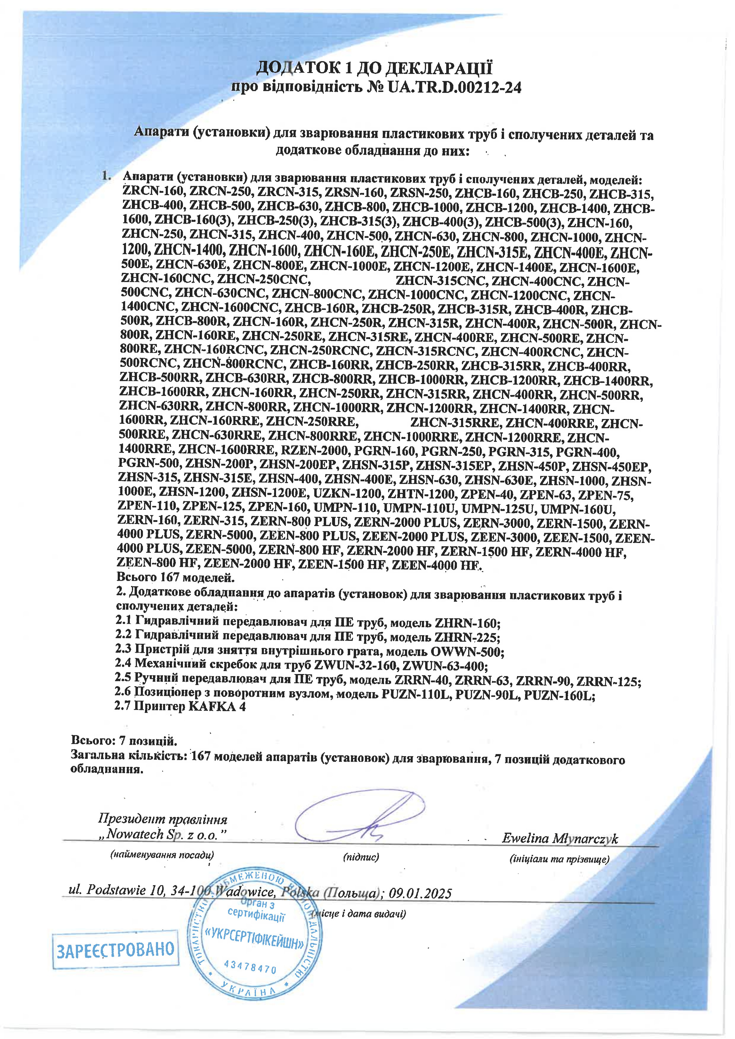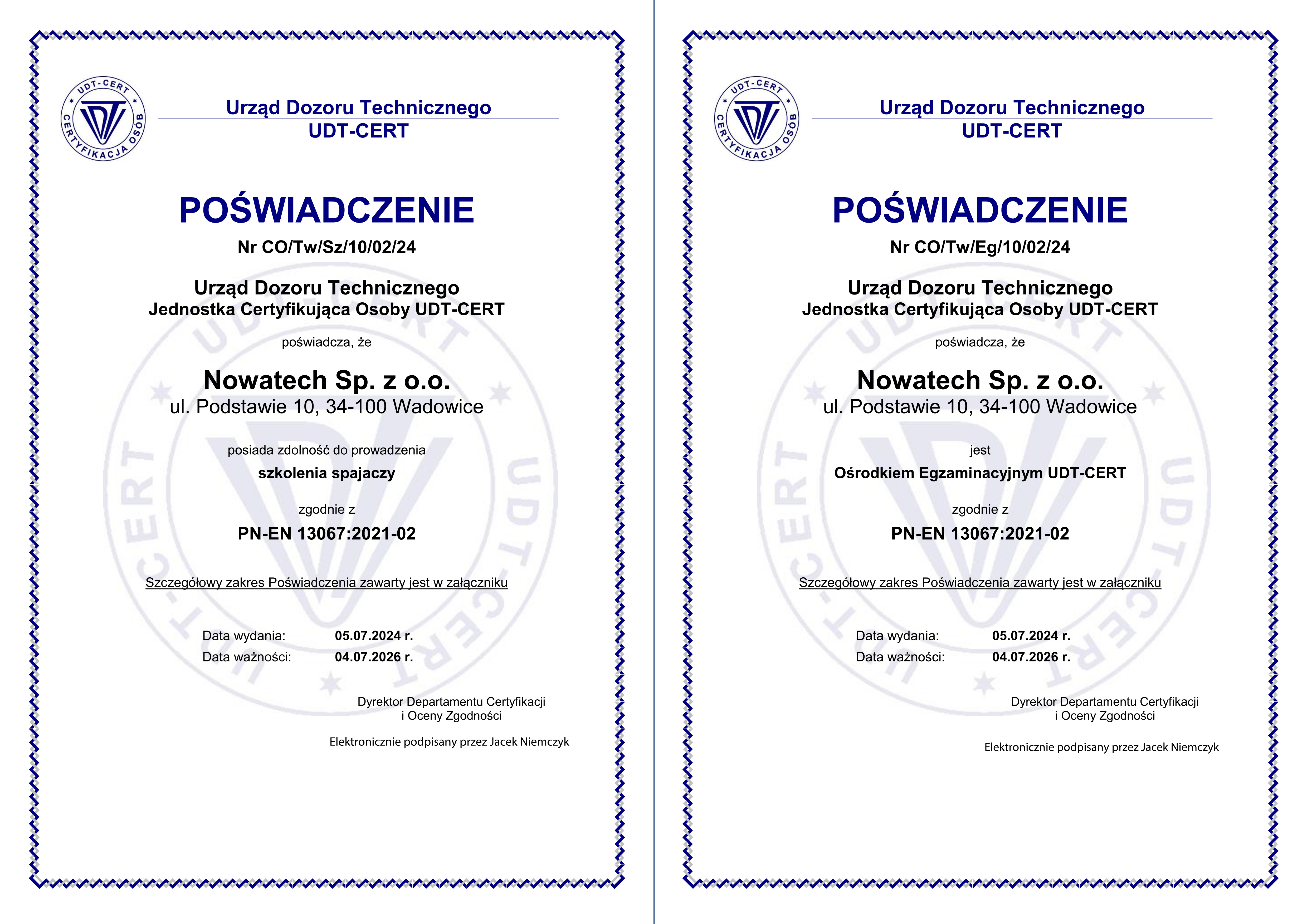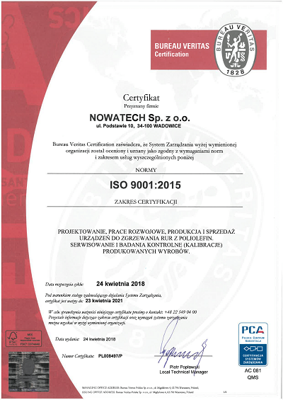 Certyfikat wydany przez Bureau Veritas zaświadczający, że system zarządzania firmy Nowatech został oceniony i uznany za zgodny z wymaganiami norm ISO 9001:2015 w zakresie projektowania, pracy rozwojowej, produkcji i sprzedaży urządzeń do zgrzewania rur z poliolefin, serwisowania oraz wykonywaniu badań kontrolnych produkowanych wyrobów.