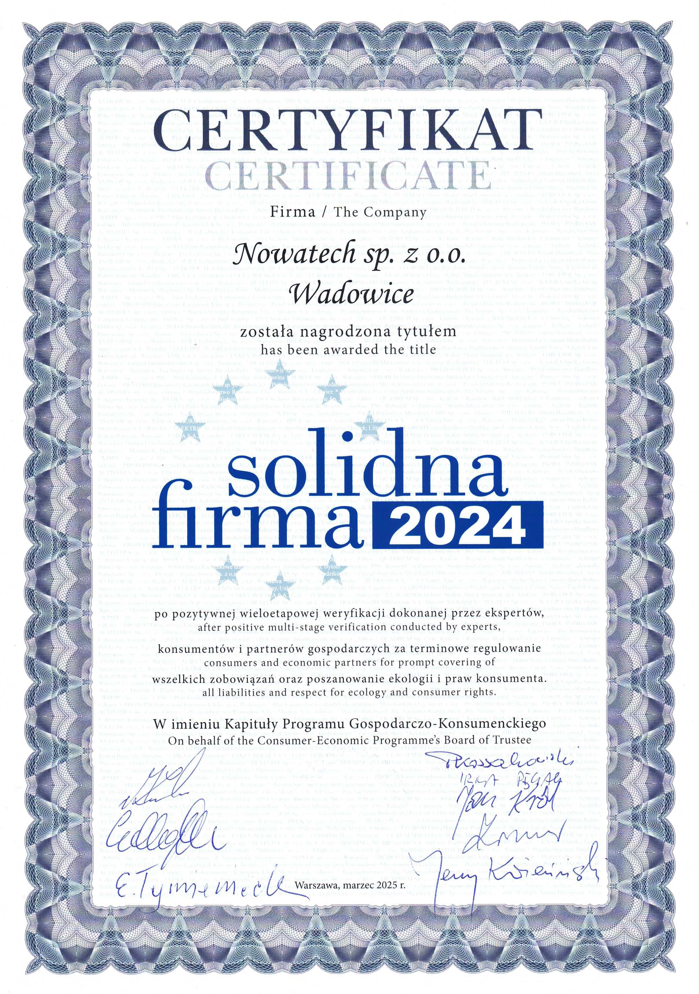 Z dumą informujemy, że nasza firma Nowatech sp. z o.o. z siedzibą w Wadowicach została wyróżniona prestiżowym tytułem „Solidna Firma 2024”. Nagroda ta jest przyznawana po pozytywnej, wieloetapowej weryfikacji przeprowadzonej przez niezależnych ekspertów. Potwierdza ona terminowe regulowanie zobowiązań wobec konsumentów i partnerów gospodarczych, jak również poszanowanie zasad ekologii oraz praw konsumenta. To dla nas ogromne wyróżnienie, które motywuje nas do dalszego działania w duchu odpowiedzialności, rzetelności i przejrzystości.