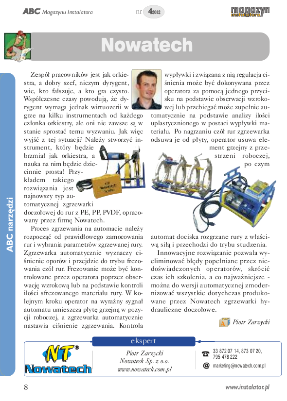 Od dziesięciu lat Nowatech produkuje zgrzewarki do rur z tworzyw sztucznych. Początkowo spółka wtrwarzała kilka sztuk urządzeń rocznie, dziś - sa ich setki. Obecnie Nowatech to jeden z największych polskich producentów zgrzewarek...