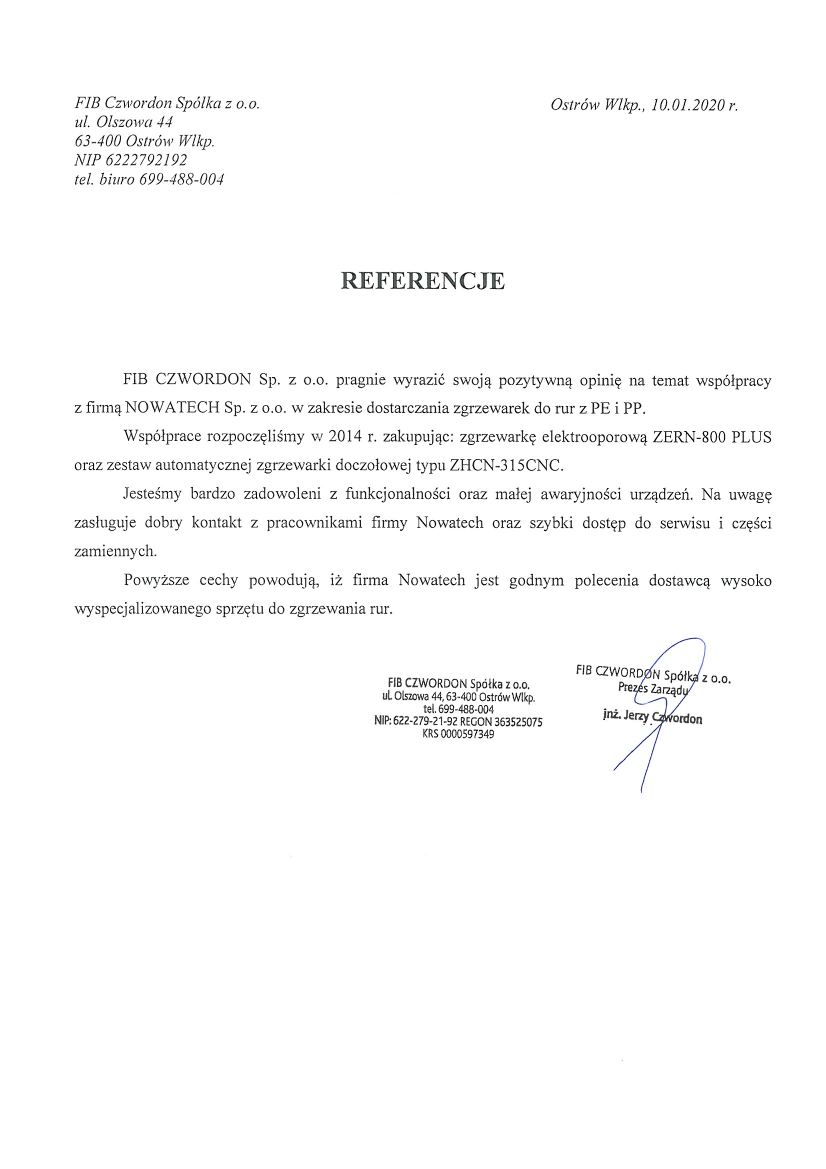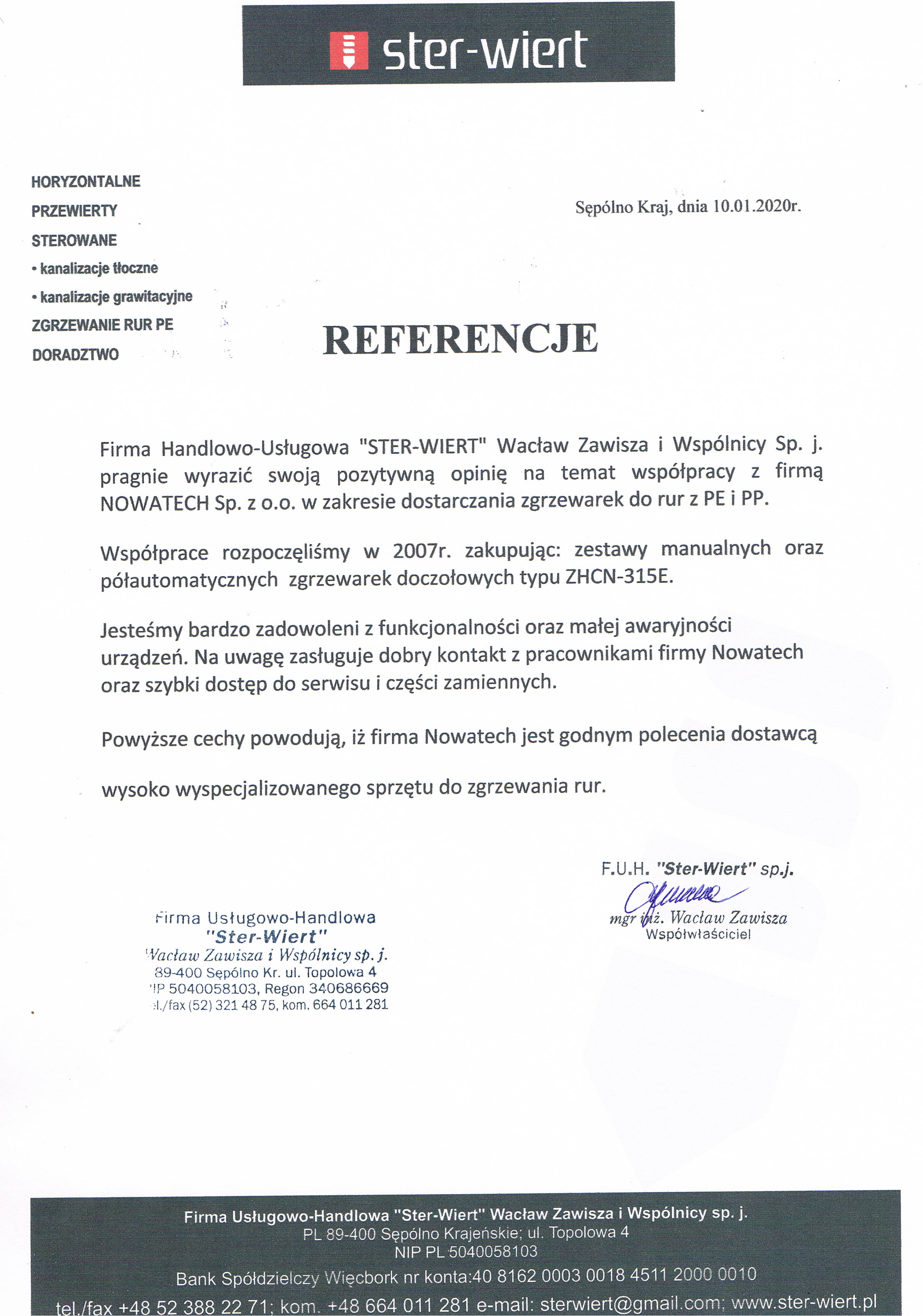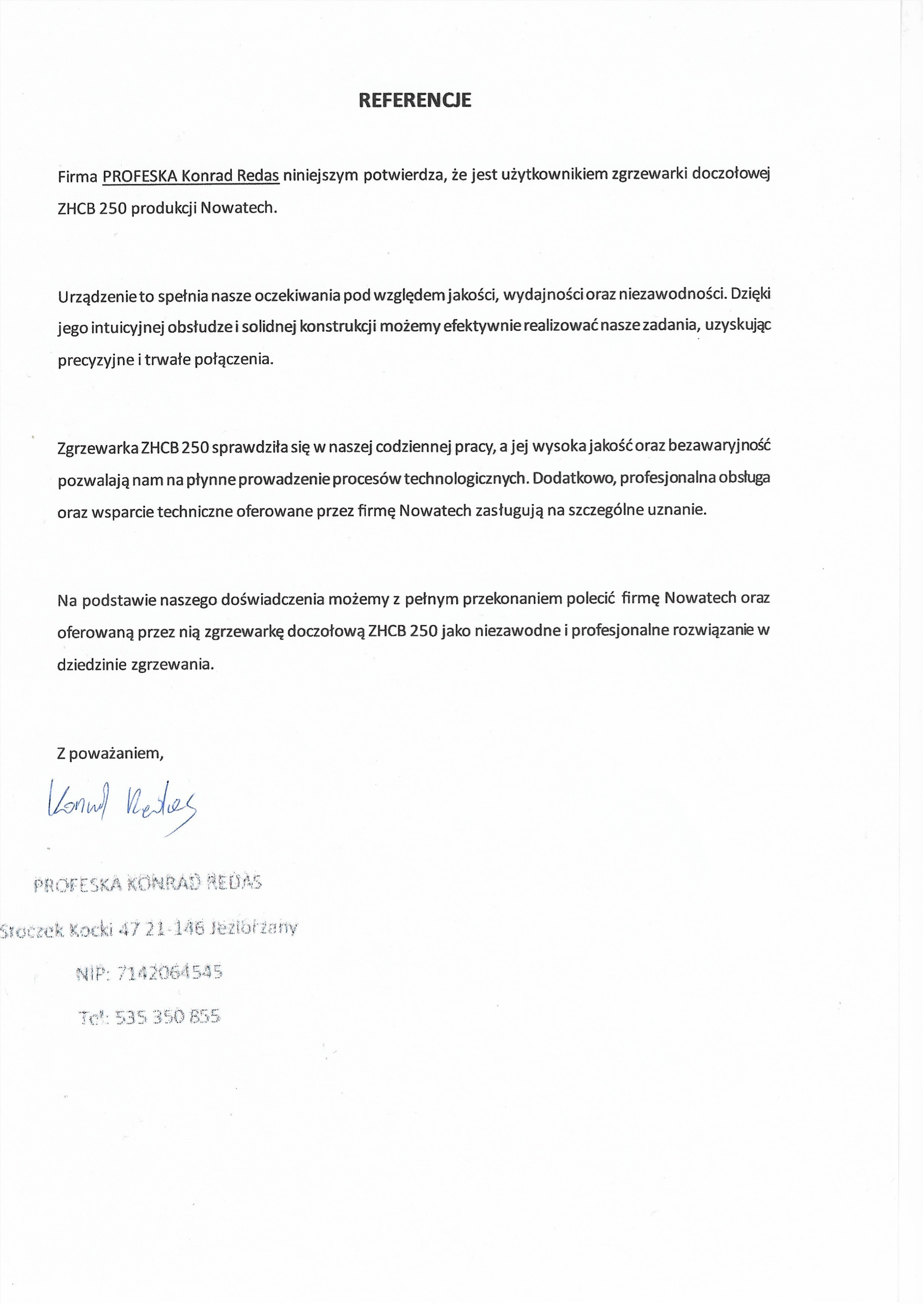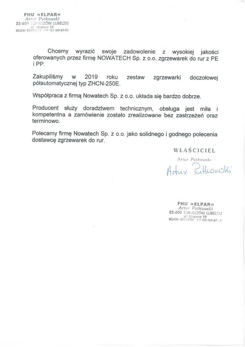 Potwierdzeniem profesjonalizmu firmy Nowatech, są listy referencyjne nadesłane przez naszych klientów. Wysoka jakość materiałów użytych do produkcji zgrzewarek oraz profesjonalna obsługa klienta jest gwarancją zadowolenia ze współpracy z naszą firmą. Dziękujemy za zakup zgrzewarek firmy Nowatech i zaufanie, jakim nas Państwo obdarzyli.