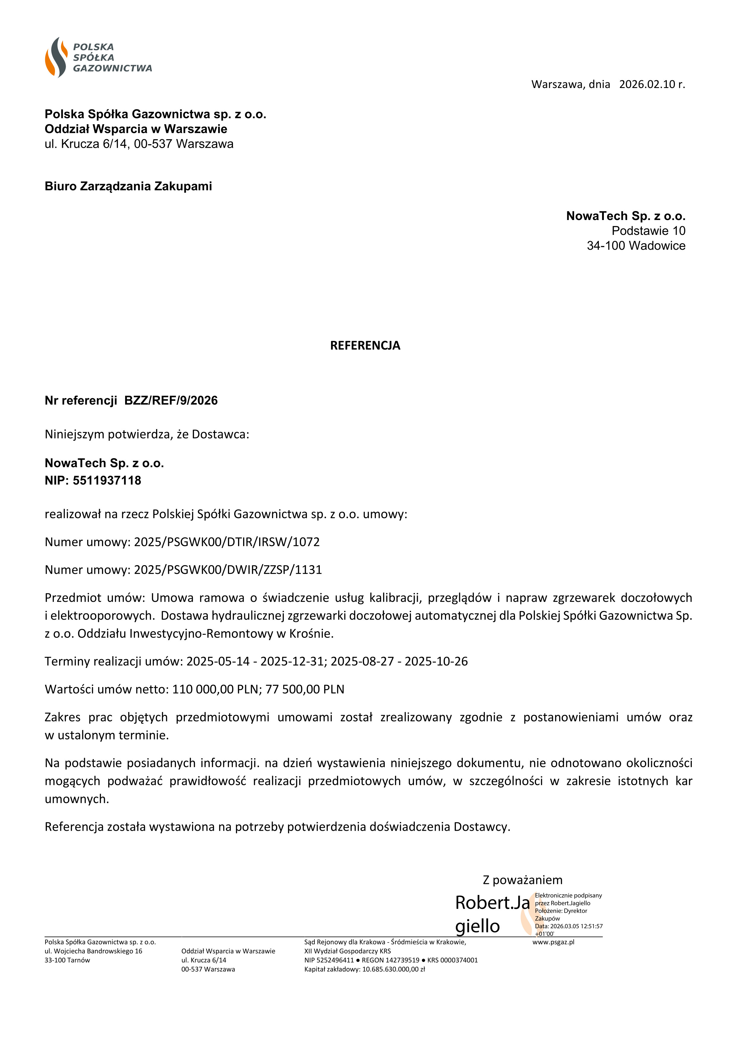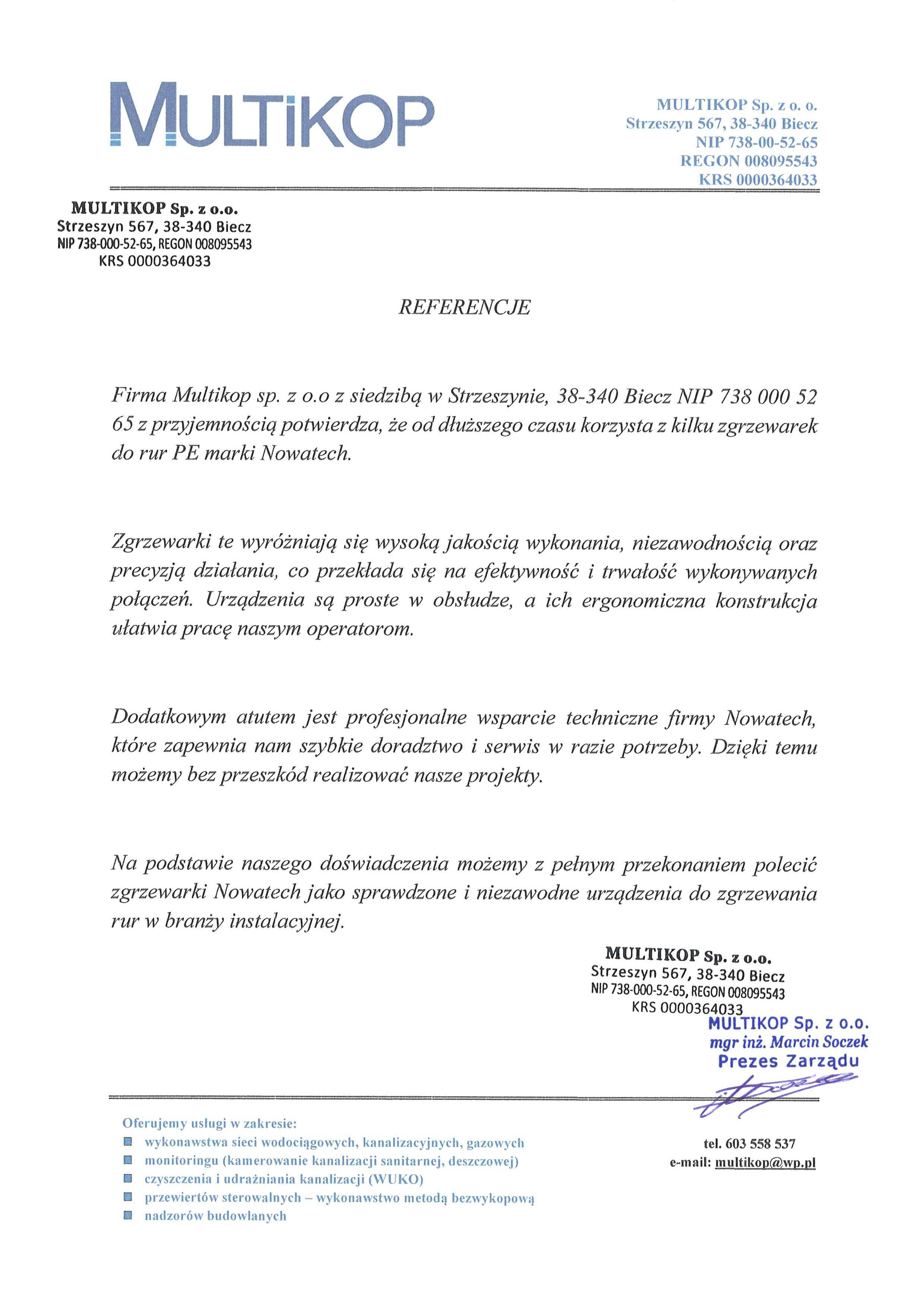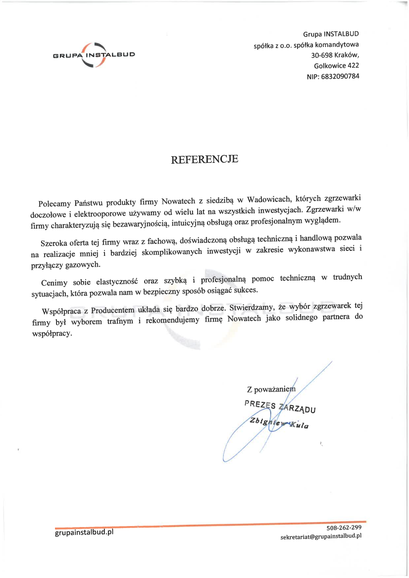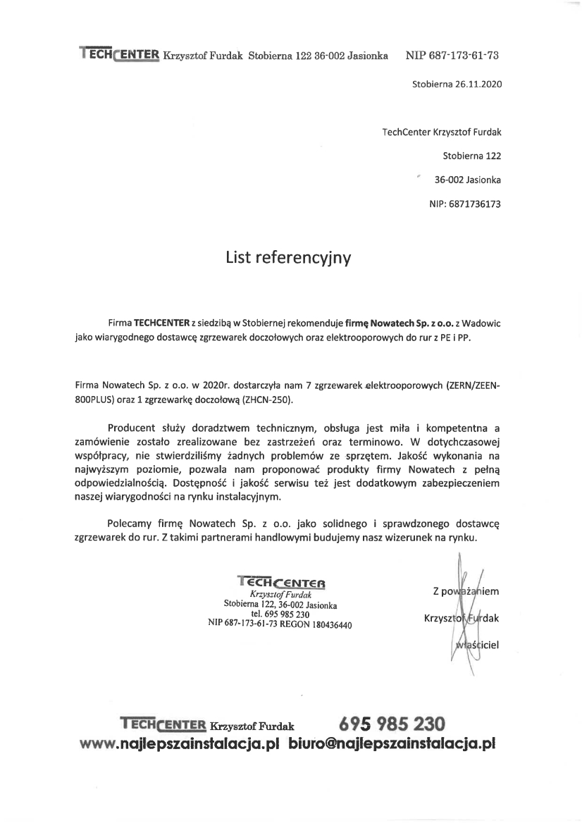 Potwierdzeniem profesjonalizmu firmy Nowatech, są listy referencyjne nadesłane przez naszych klientów. Wysoka jakość materiałów użytych do produkcji zgrzewarek oraz profesjonalna obsługa klienta jest gwarancją zadowolenia ze współpracy z naszą firmą. Dziękujemy za zakup zgrzewarek firmy Nowatech i zaufanie, jakim nas Państwo obdarzyli.